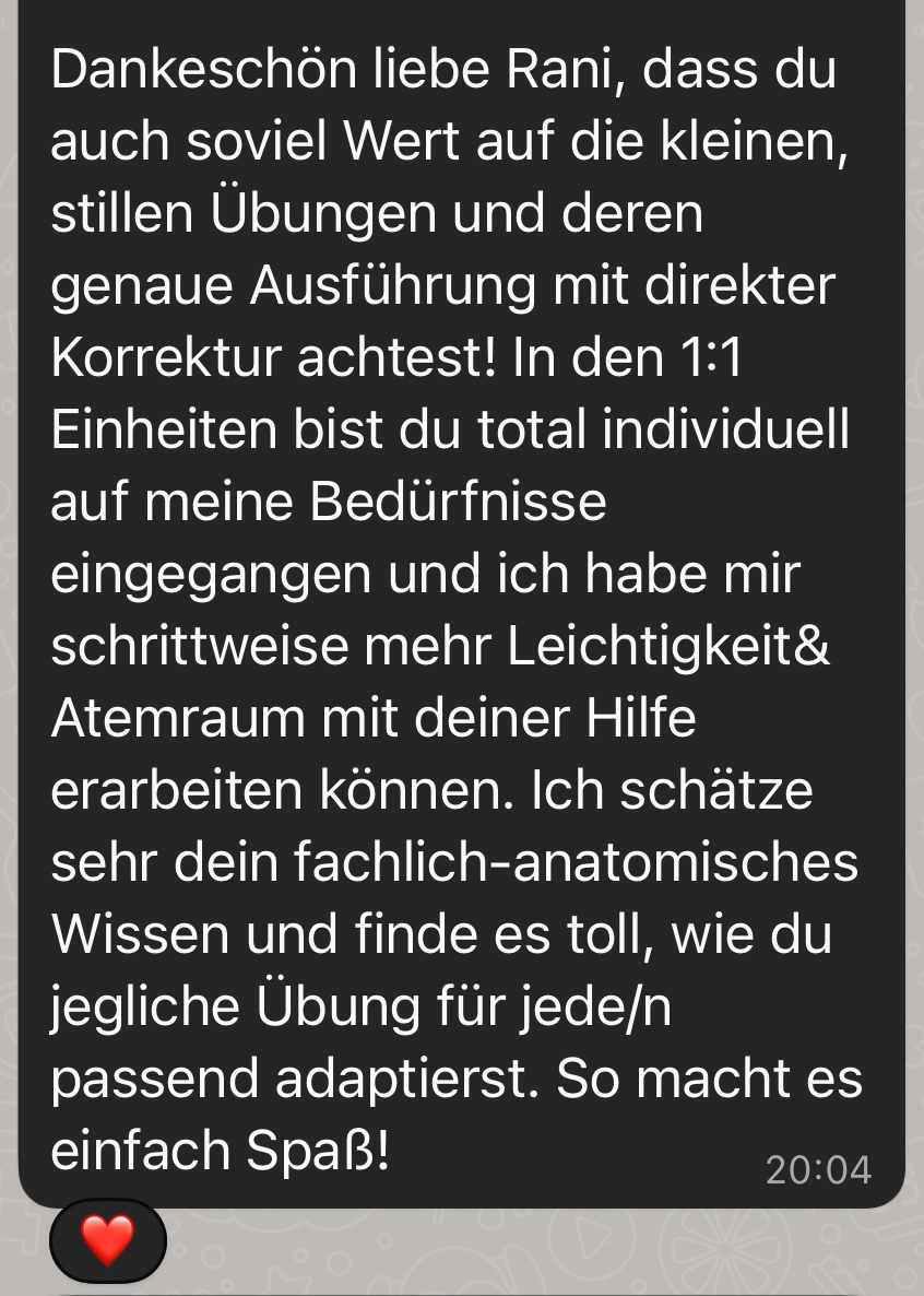 Für den ersten Termin nehme ich mir 75 Minuten Zeit, damit genügend Raum für Ankommen, Vorgespräch und Praxis bleibt.